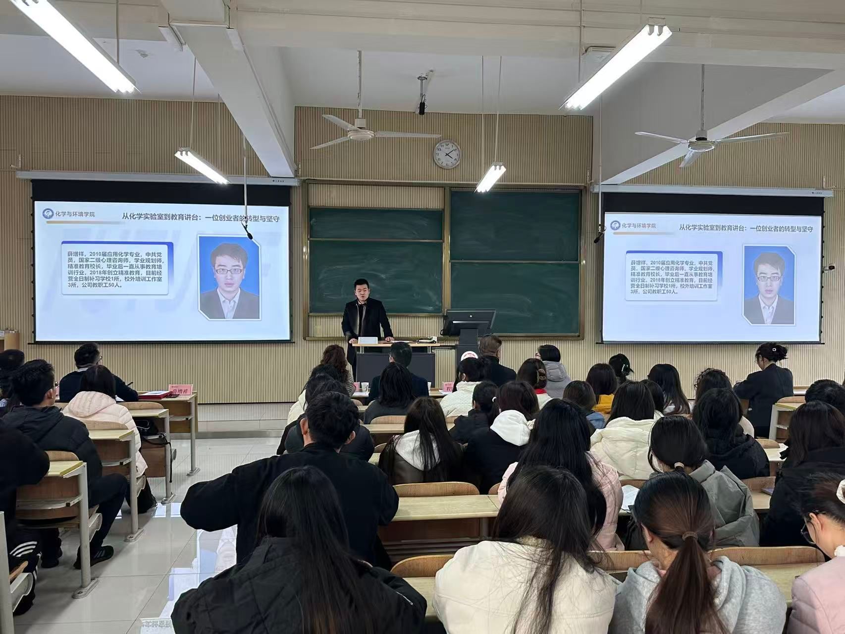 在专题分享环节,2014届应用化学专业校友、现为精准教育培训学校创始人的薛增祥在1301教室,面向应用化学专业学生,以“从化学实验室到教育讲台:一位创业者的转型与坚守”为题分享创业故事。他结合自身经历,生动讲述了如何将化学专业严谨的逻辑思维与实验方法,转化为教育创业中的课程设计与运营管理的宝贵经验;分享了在创业过程中面临的挑战、坚守的初心以及跨界发展的心路历程,并鼓励学弟学妹们勇于尝试、敢于突破,在扎实学好专业知识的同时,积极培养跨领域能力与创新思维。