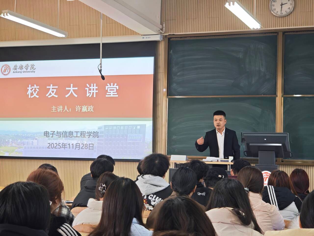 工作动态2025年11月28日下午,电信学院在1304教室成功举办了“校友大讲堂”活动。本次活动特别邀请了学院优秀校友、2013届电子信息技术毕业生许嬴政担任主讲嘉宾,他以自身成长与创业经历为蓝本,为在校学子带来了一场兼具深度与温度的精彩分享,为母校人才培养与家乡高质量发展注入新动能。