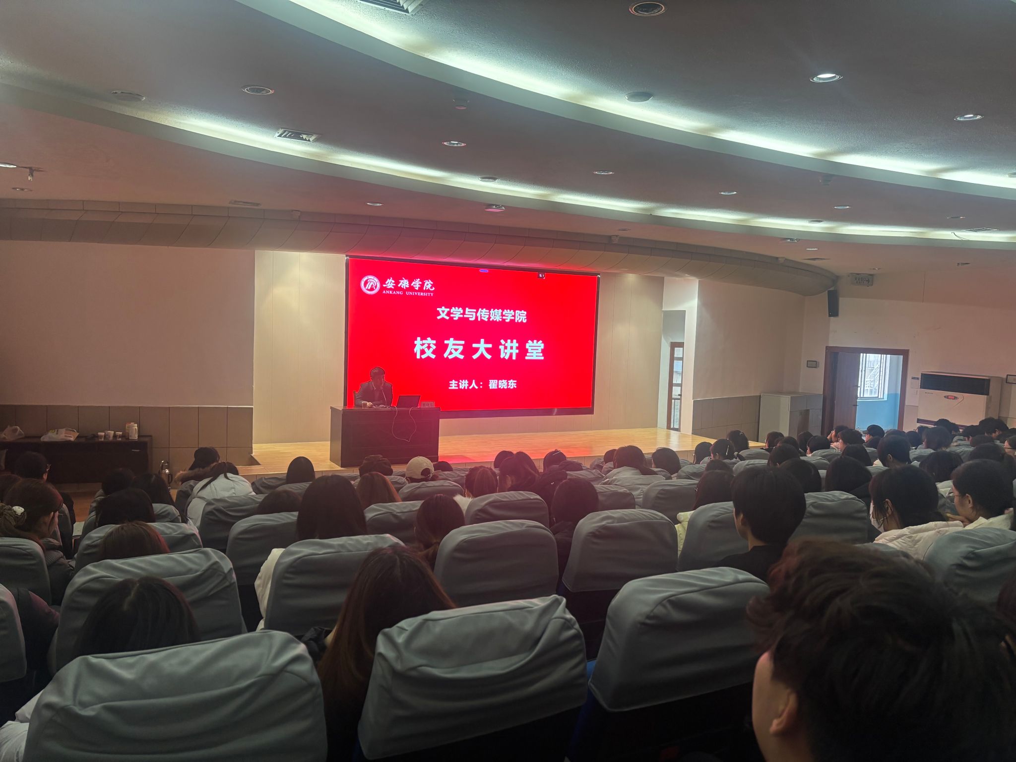 工作动态12月19日下午,文学与传媒学院在江南校区一号楼报告厅举办校友大讲堂活动。本次活动特邀陕西安康沁园春文化产业有限公司总经理、安康学院校友翟晓东担任主讲,我院党总支副书记侯红艳、学工办主任薛涛及学院部分学生代表参加。活动由侯红艳主持。